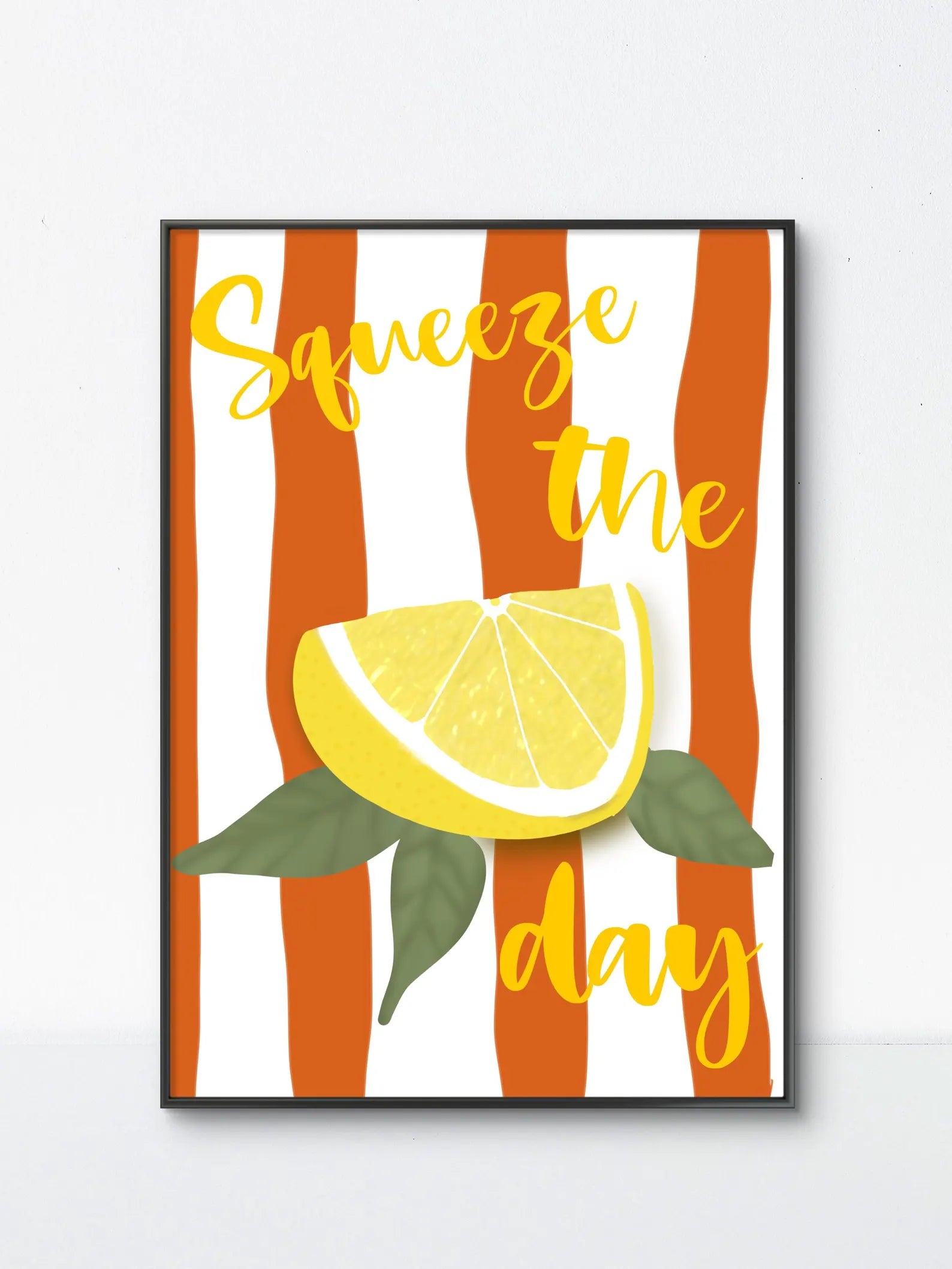 Squeeze the day lemon art print- bold illustration with orange stripes- motivational wall art